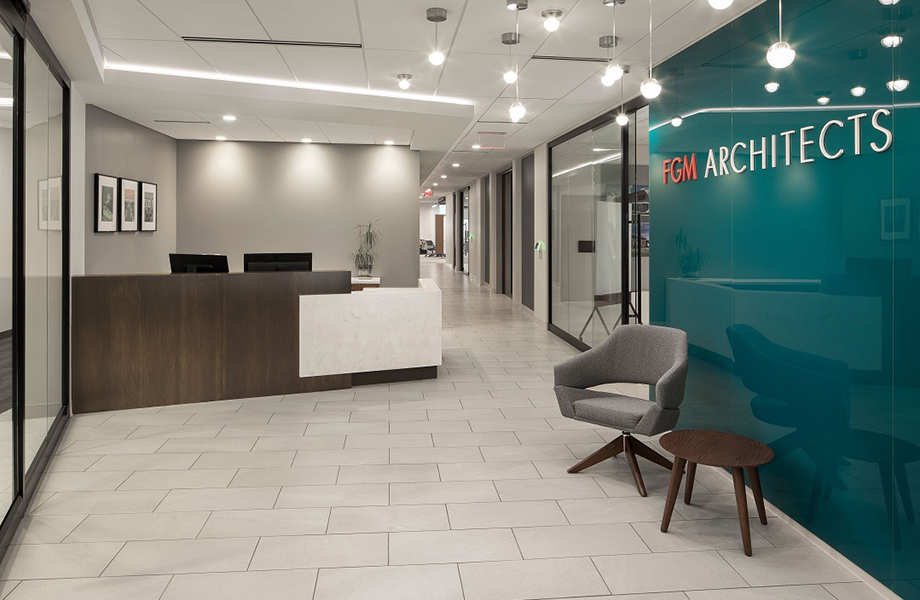 “Our new office is meant to serve as a statement piece for the firm to help refresh the FGMA brand,” said Laura Wheeler, an interior designer at FGM Architects who was tasked with designing the company’s new office space. “Because of the way the entry is located, we angled the storefront into our space and used the Oxibronze as a branding element that you can see immediately upon departing the elevator bank.”