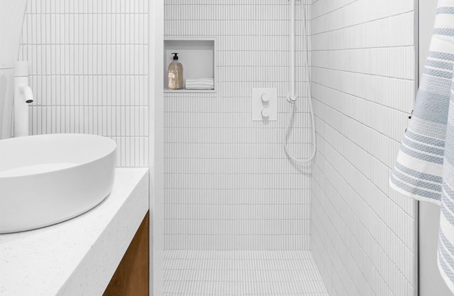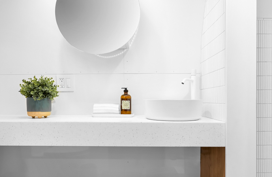 The walls, particularly those in the bathroom, were clad in Neutral Weft (5875-58) Formica® laminate, a simple, elegant design that blends perfectly with the overall look and feel of the project, while being durable and easy to clean.