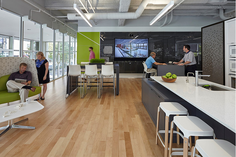 As a design firm, RATIO Design wanted collaborative spaces that encouraged creativity and drawing with products such as the Formica® Specialty Markerboard with magnetic dry erase panels. The additional benefit of having these types of panels allowed them to blend in as walls when not being used. The magnetic dry erase panels facing the open office area are used for general announcements – such as “Yoga tonight at 5:00,” brackets during Basketball finals, and other social gathering messages. The Formica® Specialty Markerboards are used constantly for designers personal use while allowing the firm to stay on top of work, as well as communicating with one another.