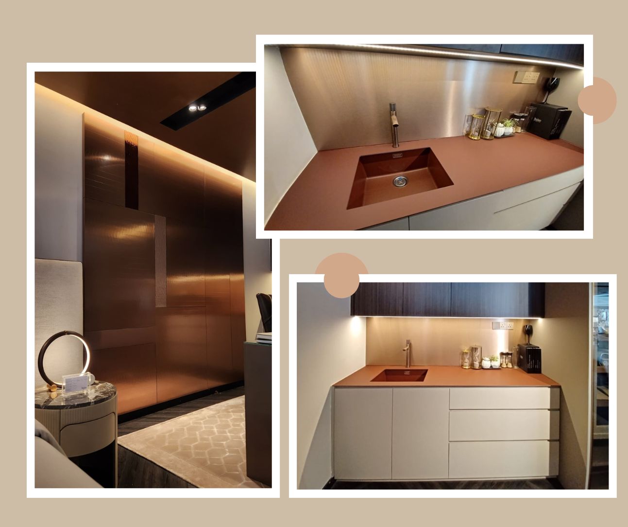 (Left) Feature wall: DecoMetal H147 Diamond Bronzetone, D2807 Dimpled Bronzetone, D8283 Cascade Tea, D2126 Bronze Brushed Aluminium, D6483 Craft Bronzetone | (Right) FENIX Kitchen Set included kitchen sink: FENIX 0751 Rosso Jaipur, FENIX 0748 Beige Arizona
