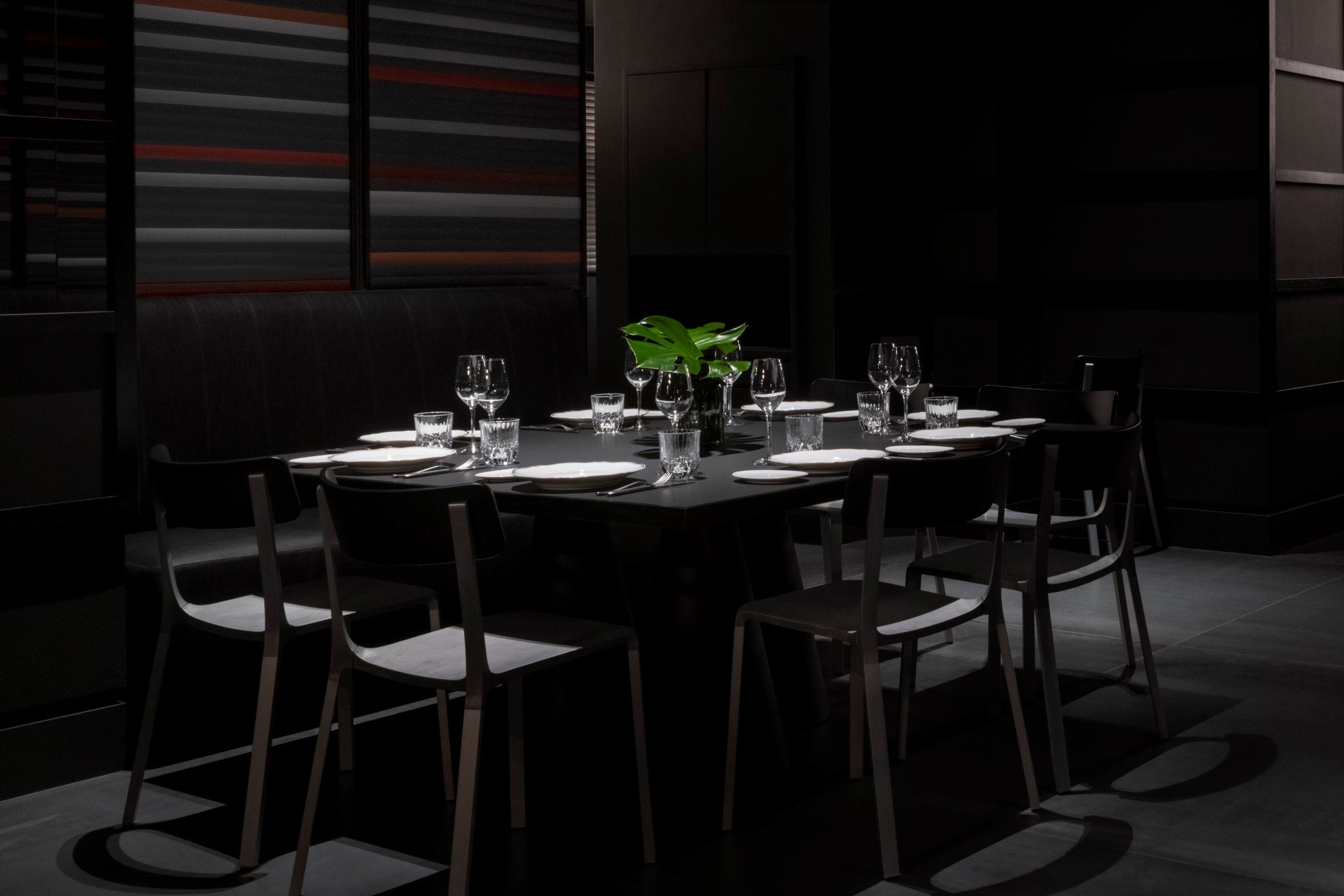 A long central table made from super-matte material, which immediately conveys the Carlo e Camilla’s concept, focused on sharing both the space and the dining experience. The table is characterised by its modularity, which allows for six different configurations. Divided by a delicate black oak spine, the 11-metre tabletop is characterised by the tactility of FENIX NTM® in Grigio Antrim. The material is super-matte, pleasant to the touch and anti-fingerprint.