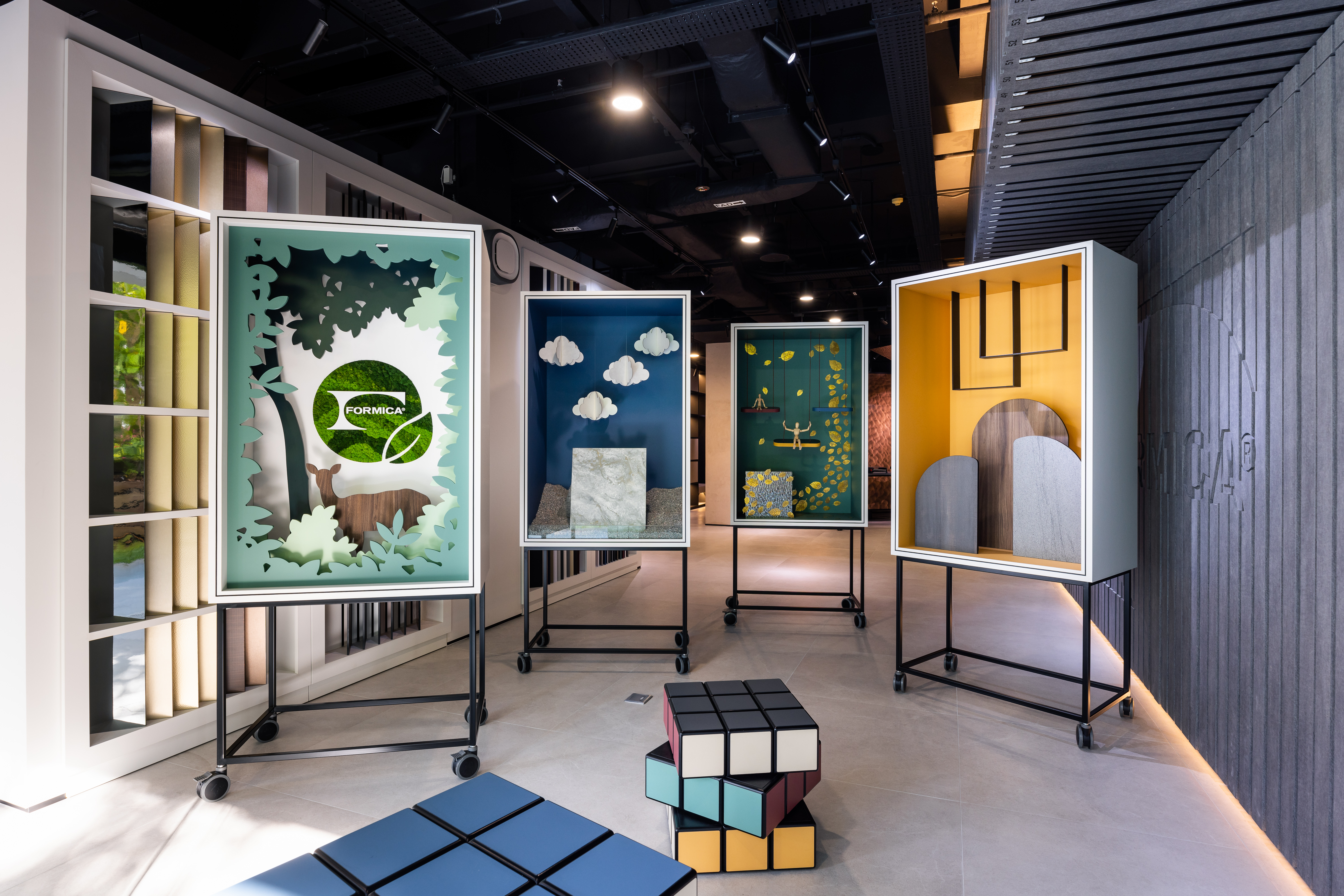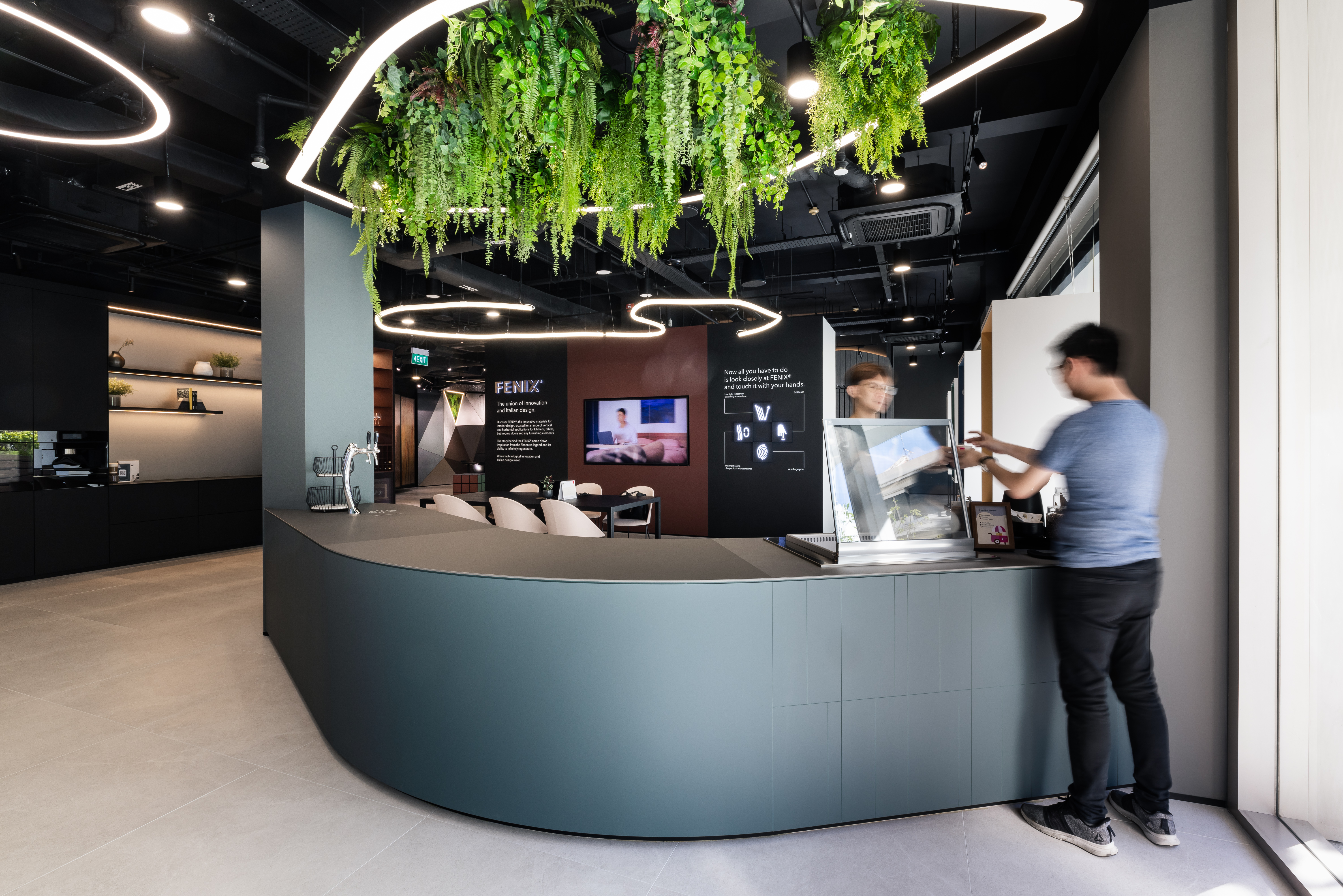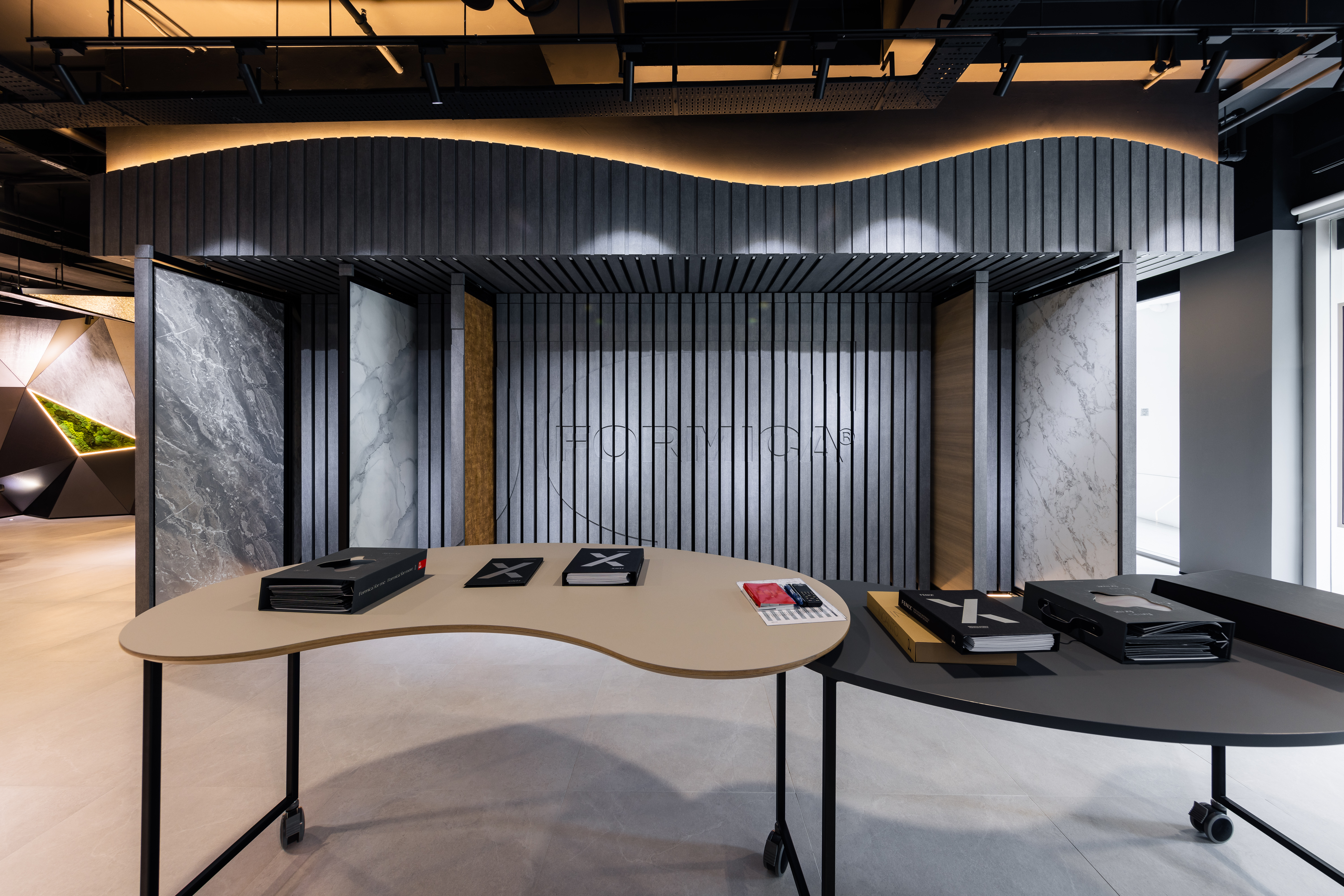 The feather in the cap of this showroom is definitely Formica’s own zone, which doubles as the company’s material library. Here, visitors and customers can experience Formica® Laminates in real scale and real size on 360˚ rotary pull out racks. The material library is equipped with cool, warm and daylight to help viewers better visualize the laminate designs in their preferred room lighting as if they were installed in their very own homes!