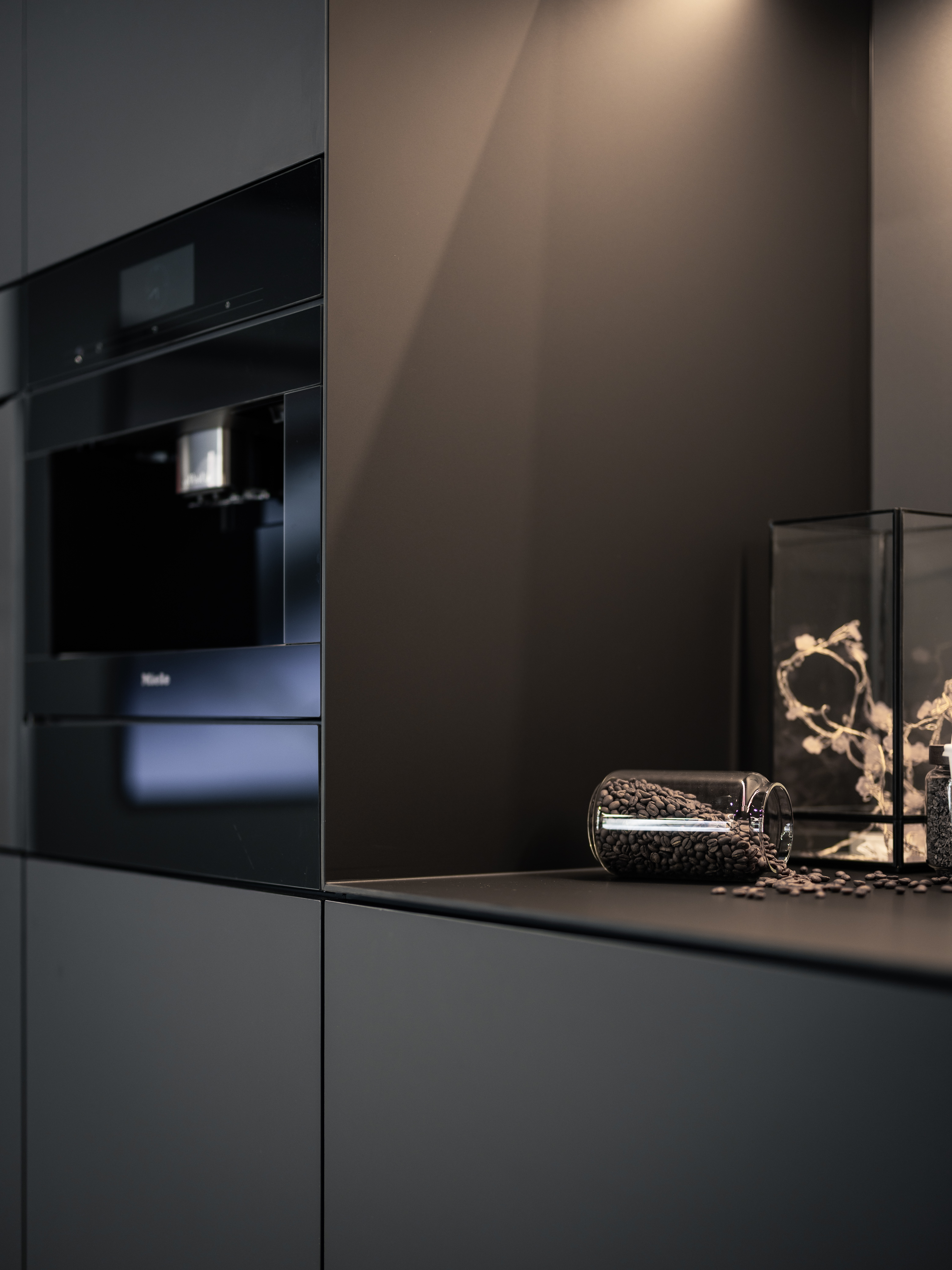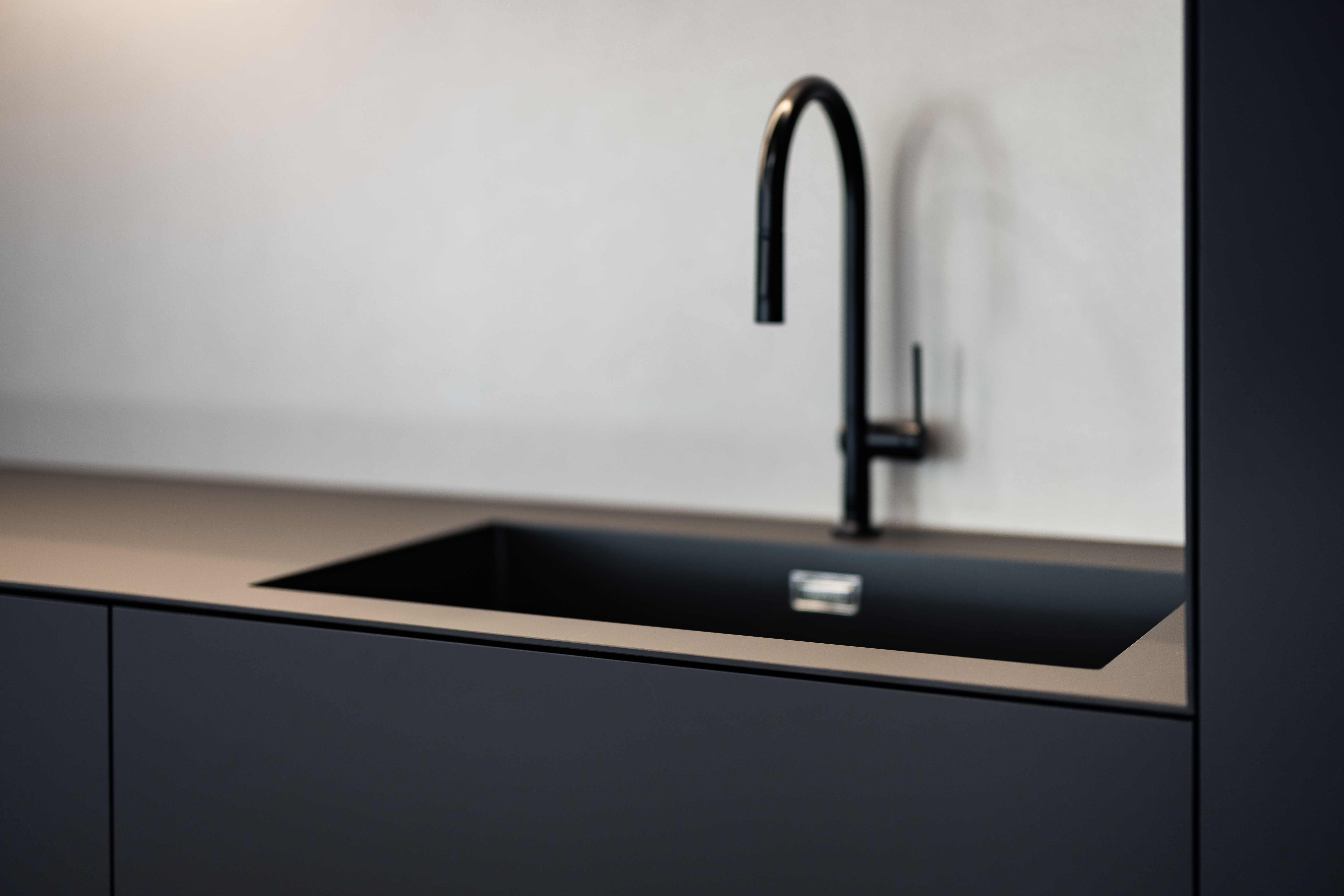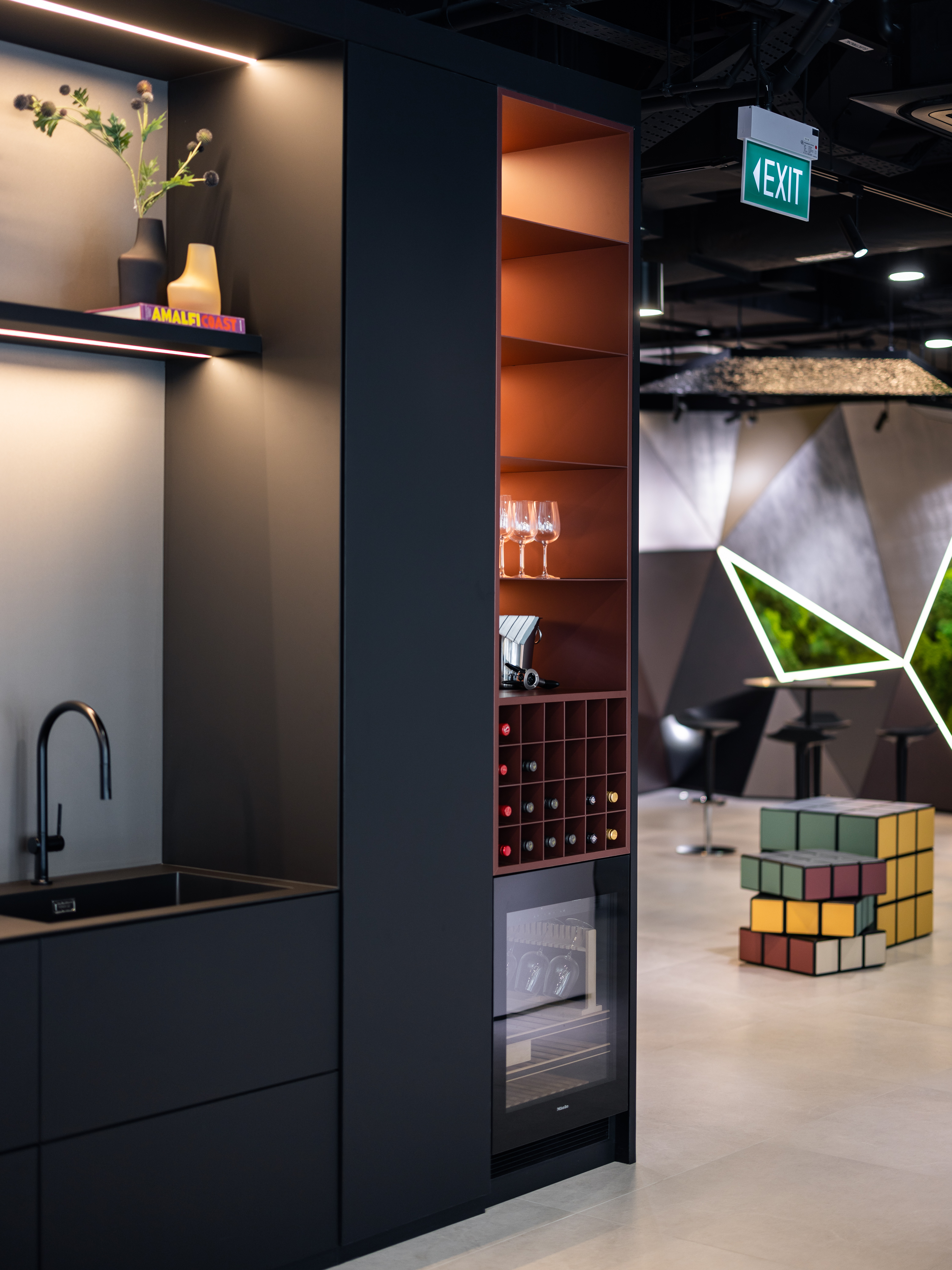 While black is a very difficult colour to maintain as stains, dust and fingerprints can be very obvious and more visible to eyes, Formica daringly utilizes black as the kitchen its main colour to highlight FENIX’s key features such as anti-fingerprint and thermal healing of micro-scratches. The application of the 6mm thick FENIX Solid on the countertop with a flush-mount integrated kitchen sink certainly added some beauty, clean and sleek look and pleasant atmosphere to the kitchen.