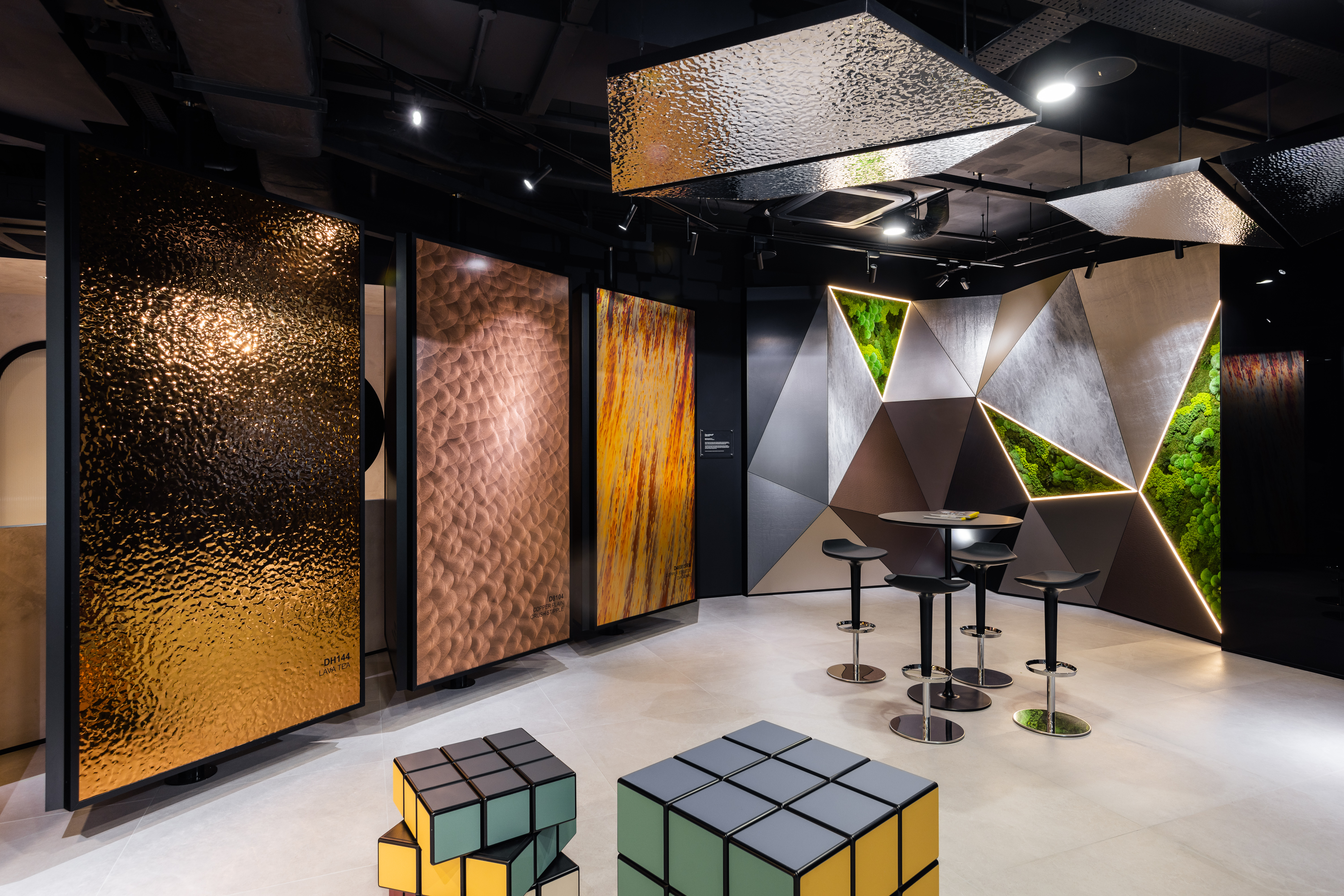 One of our star products, the DecoMetal®, (a range of decorative metal laminates), has a selected décor for display in full sheets, to reveal the richness of its metallic colour and texture.