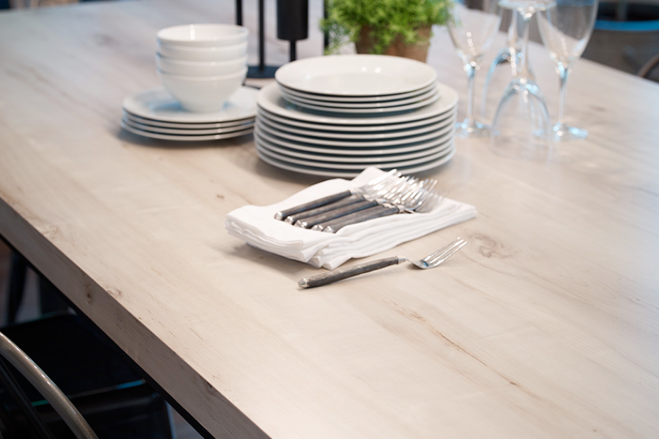You may think, "Since it's textured, it might stain more." However, textured laminates retain the same cleaning characteristics as flat laminates, allowing you to clean accidental spills effortlessly. Just be sure to remove the oils by wiping them off with a mild soapy solution.