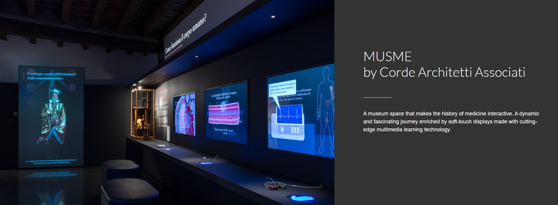 MUSME by Corde Architetti Associati is a museum space that makes the history of medicine interactive. Opened in 2015, is located inside the oldest hospital in Padua, the Hospital of St. Francis from 1414, now the first centre in Italy dedicated to dissemination and training in the medical and scientific field, a blend of science, technology, history, interaction and emotional communication.