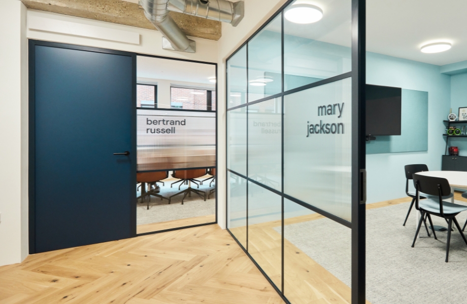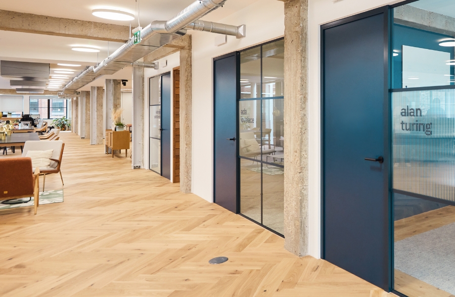 La nueva sede de LoopMe -diseñada por los especialistas en espacios de trabajo de Peldon Rose-, ofrece un ambiente de oficina vibrante, colaborativo y adaptado al trabajo moderno. Para las puertas interiores se seleccionó el laminado Formica® en F8242 Night Sea por su toque contemporáneo y elegante. El laminado azul profundo realza la estética de la oficina y al mismo tiempo garantiza durabilidad y fácil mantenimiento, lo que lo hace ideal para áreas muy transitadas.