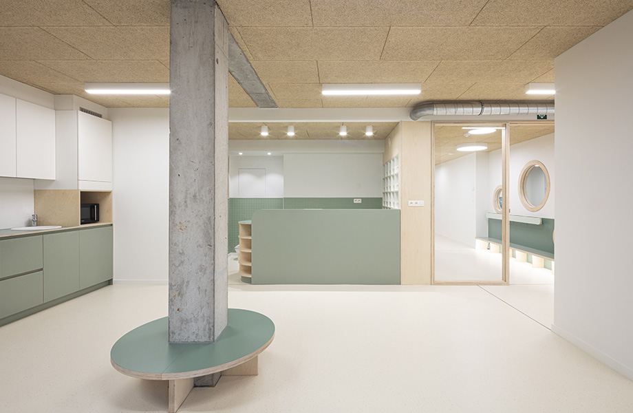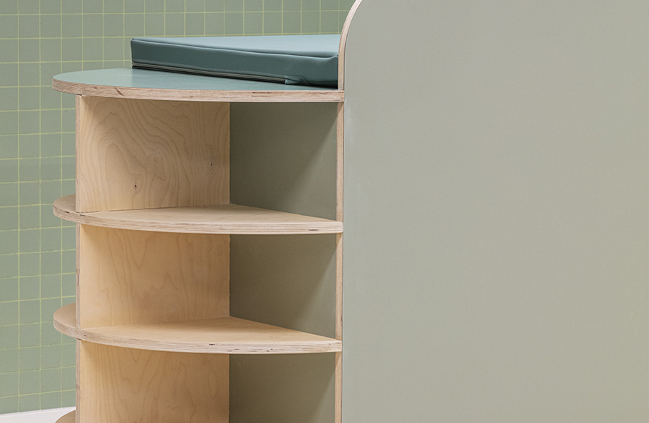 “Utmaningen var att konvertera det tillgängliga utrymmet, ursprungligen planerat för två lägenheter, till en förskola. Vi letade efter en mjuk färgpalett i kombination med björk för att skapa värme och trevnad. Rundade former, ton-i-ton-färger och lekfulla element utgör grunden för denna design. Ton-i-ton-effekten kunde vi bara uppnå genom att använda Formica®-kollektionen tillsammans med Homapal.”