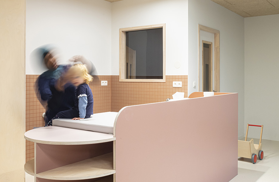 Specialanpassade möbler i olika material designades och skräddarsyddes för barnen och personalen, såsom genomräckningsskåp och möbler med inbyggda trappsteg (så att barnen kan klättra upp på möblerna) samt belysning i barnhöjd.