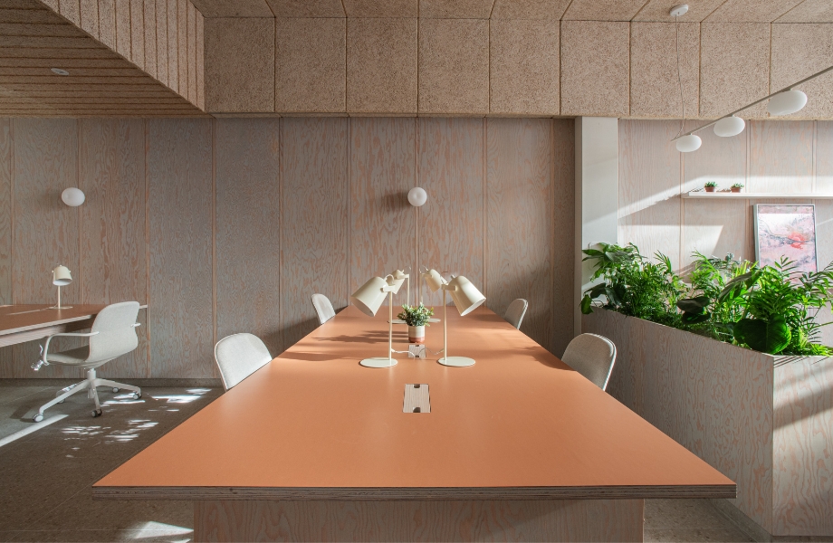 Studio Milne valde det moderiktiga Formica®-laminatet i F8241 Earthenware till att skapa fantastiska bordsskivor för denna moderna kontorsdesign i London.