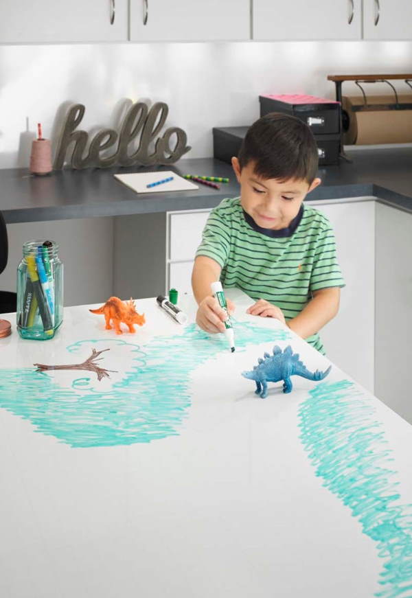 ไม่ต้องกังวลไป ไม่จำเป็นต้องห่วงเรื่องลูกๆ ของคุณทำลายผืนผนังทาสีสดใหม่ด้วยผลงานชิ้นเอกสุดวิจิตรอีกต่อไป ยกความดีความชอบให้กับ Formica® Writable Surfaces