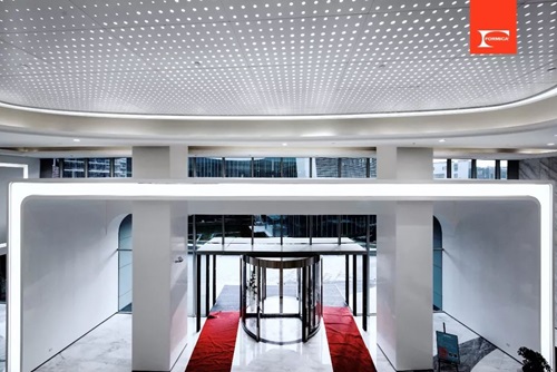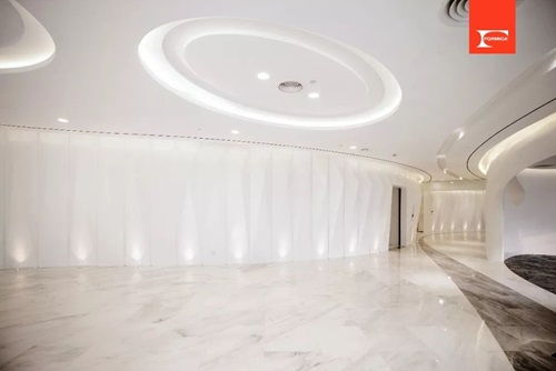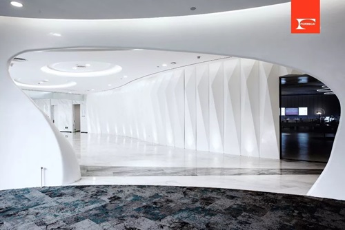 作为一个超大型、旗舰级综合体,该项目大量使用了富美家®色麗石®为饰面材料,在不同的区域都完美体现了它的效果和张力。天花板的设计细节独树一帜,与墙地面进行柔和的呼应,有纯净和灵动质感;以水滴形态出发,动线流畅自然。