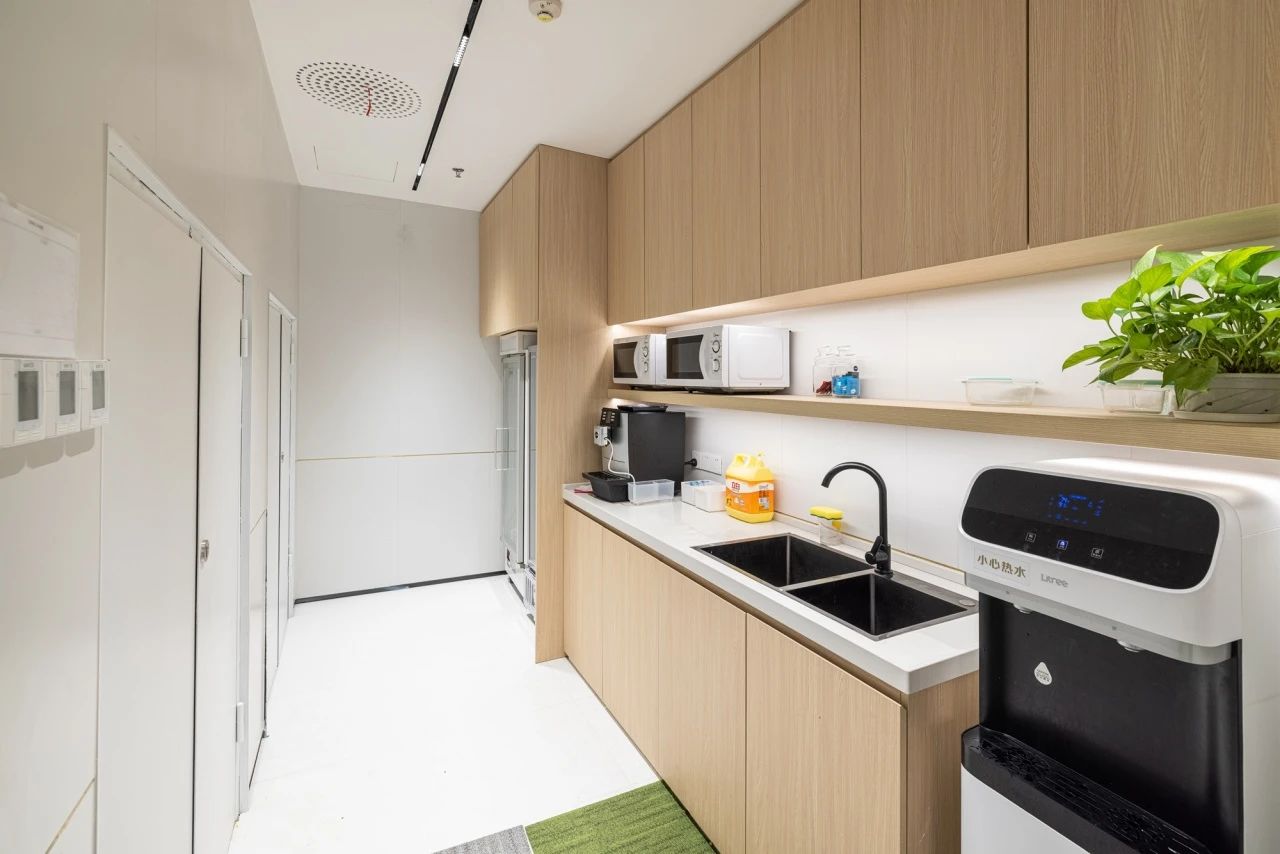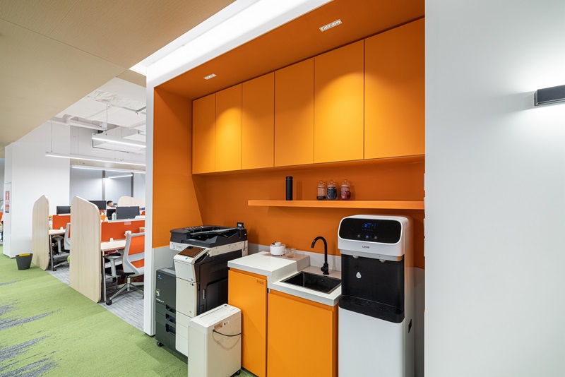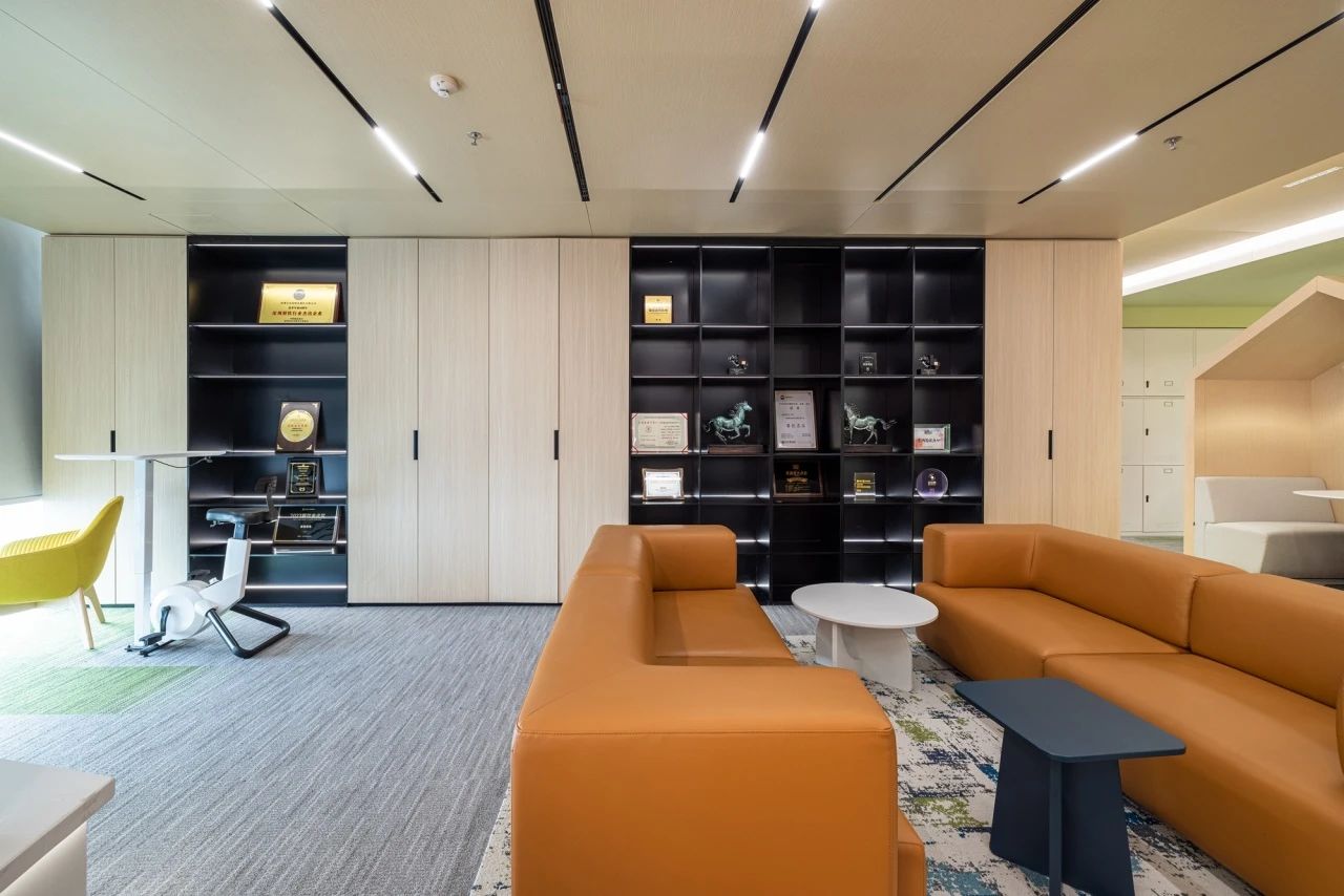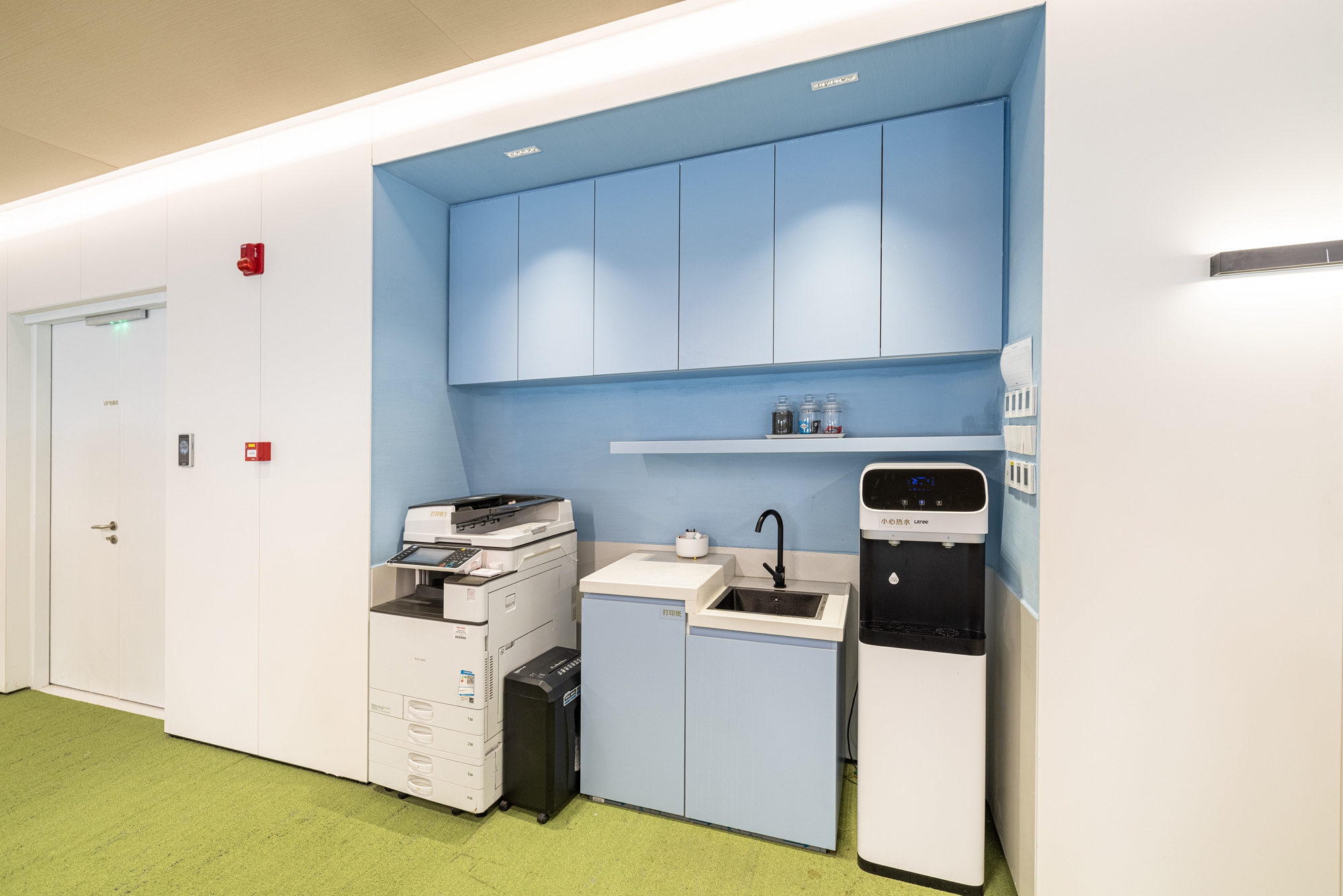 不同区域的茶水间采用装饰高压面板洁不同的颜色做点缀,活力的橙、平和的蓝、沉稳的棕,丰富空间层次感的同时,营造快节奏工作中转换情绪、释放压力的缤纷驿站,让日常也变得多姿起来。