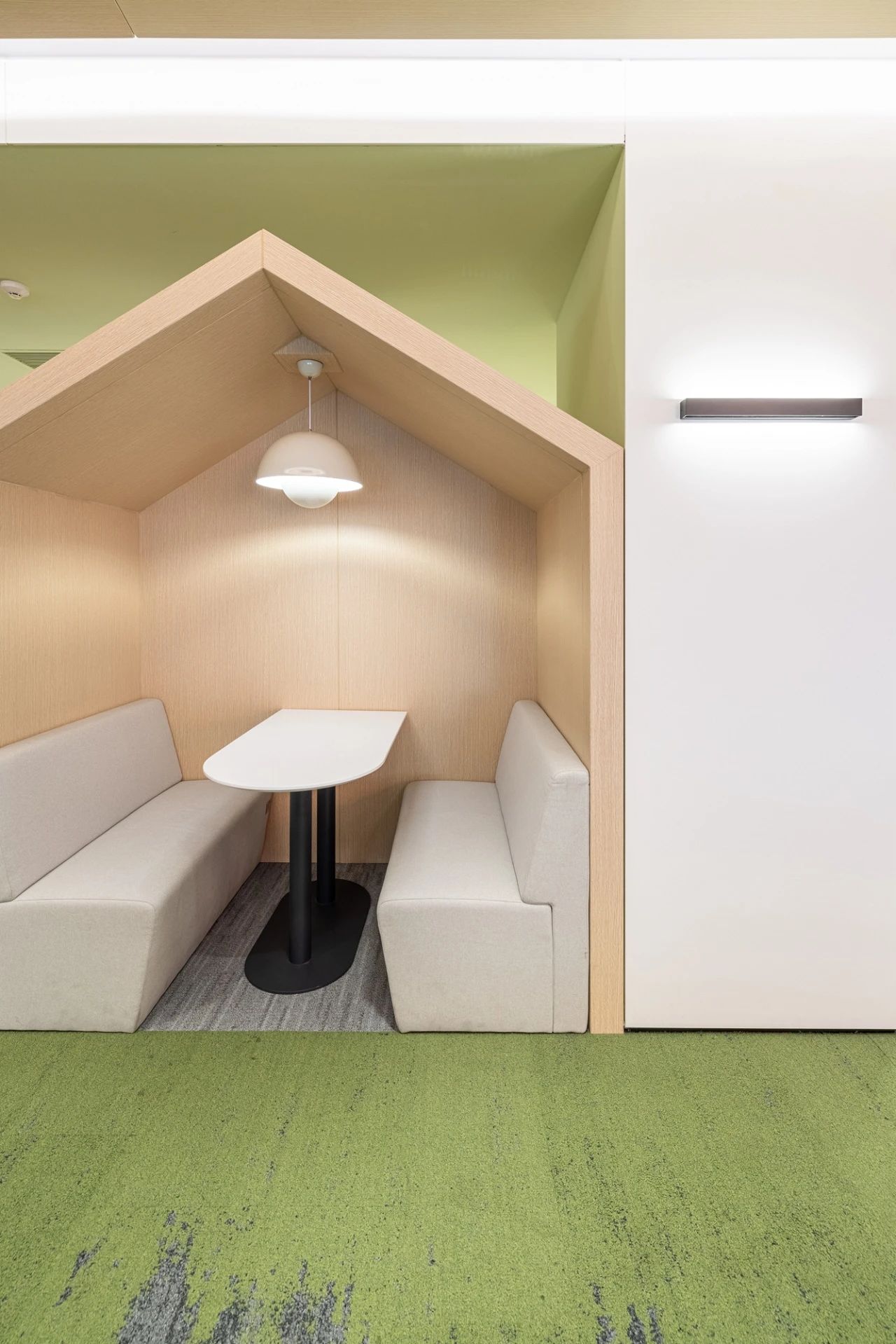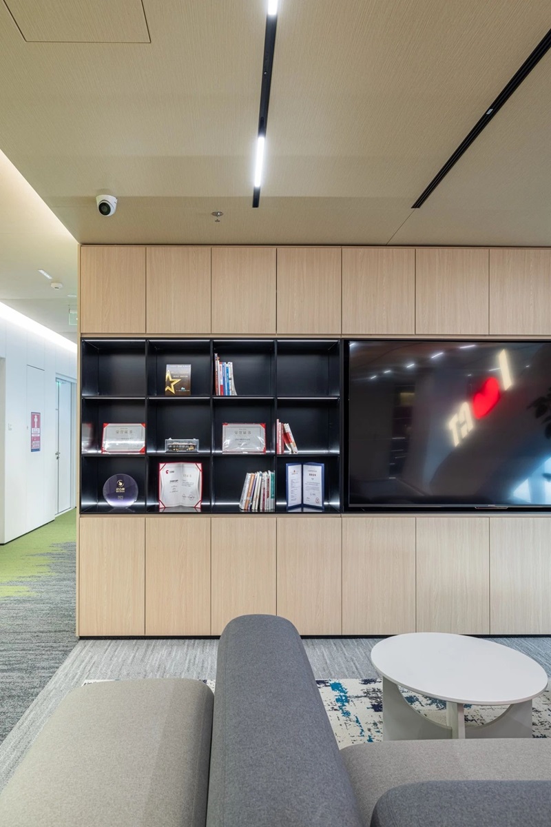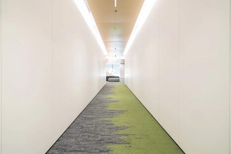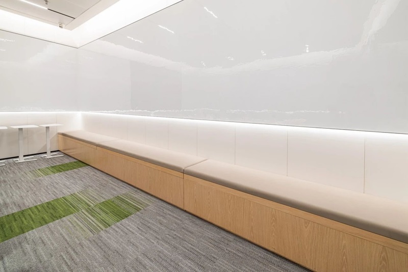 本案公共区域墙面大面积应用FENIX® 0029 奶油白,简约明亮又不失温暖。搭配装饰高压面板细腻木纹打造的家具饰面,和地毯蔓延的斑驳绿意,不着痕迹地渲染出舒缓闲适的自在感觉,丰盈工作与生活的多面性。