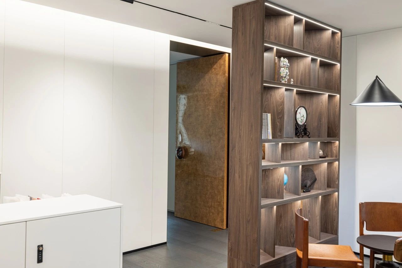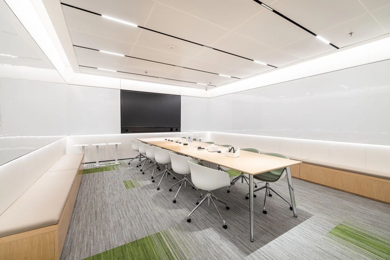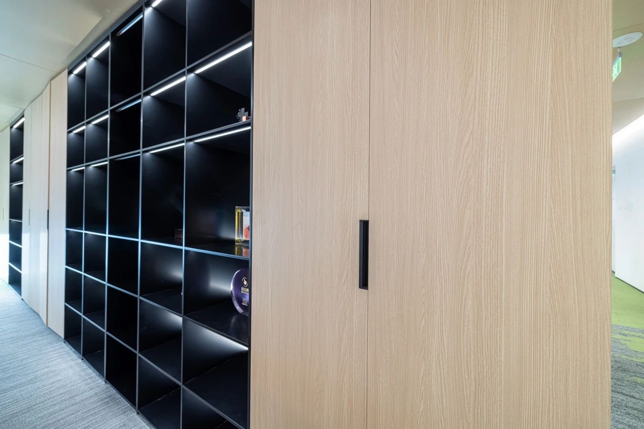 本案公共区域墙面大面积应用FENIX® 0029 奶油白,简约明亮又不失温暖。搭配装饰高压面板细腻木纹打造的家具饰面,和地毯蔓延的斑驳绿意,不着痕迹地渲染出舒缓闲适的自在感觉,丰盈工作与生活的多面性。