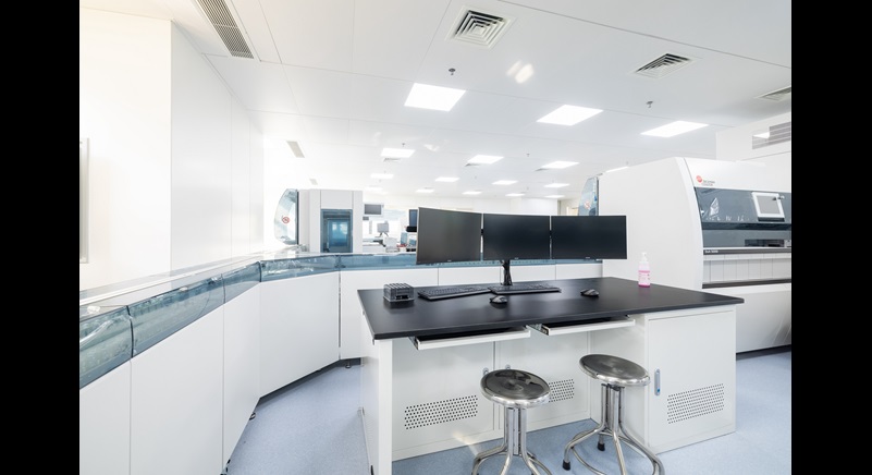 中心洁净空间、办公空间等功能区域的墙体和天花板大面积(约80,000平方米)使用了富美家®火立克®+洁菌板。