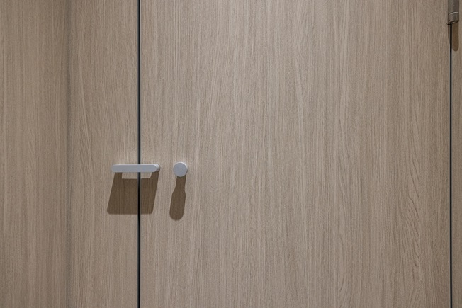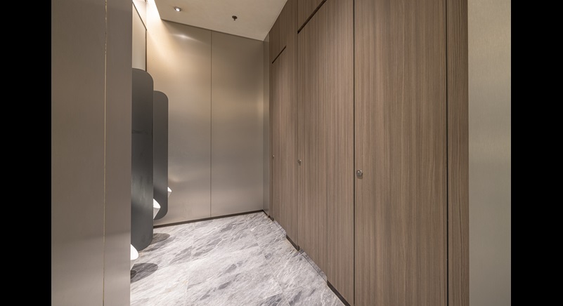 卫生间隔断应用富美家®木纹系列搭配灰色大理石墙面,时尚优雅,且中和了空间里金属和石材带来的冷感。富美家®高级装饰耐火板设计丰富、绿色环保、防潮、耐污易清理,兼具耐用和美观,应用于办公楼等公共空间,尽显超凡的品质。