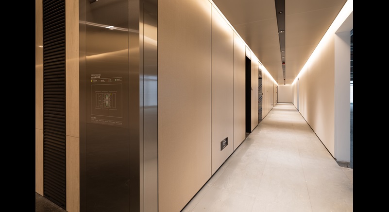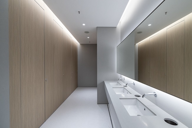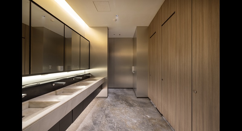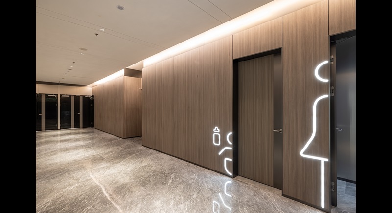 汉京中心在空间设计中遵循“把空间归还给城市,把自然与艺术融入建筑”的理念,应用富美家®木纹系列打造走廊和卫生间区域墙面和隔断,营造自然、舒适的空间氛围。