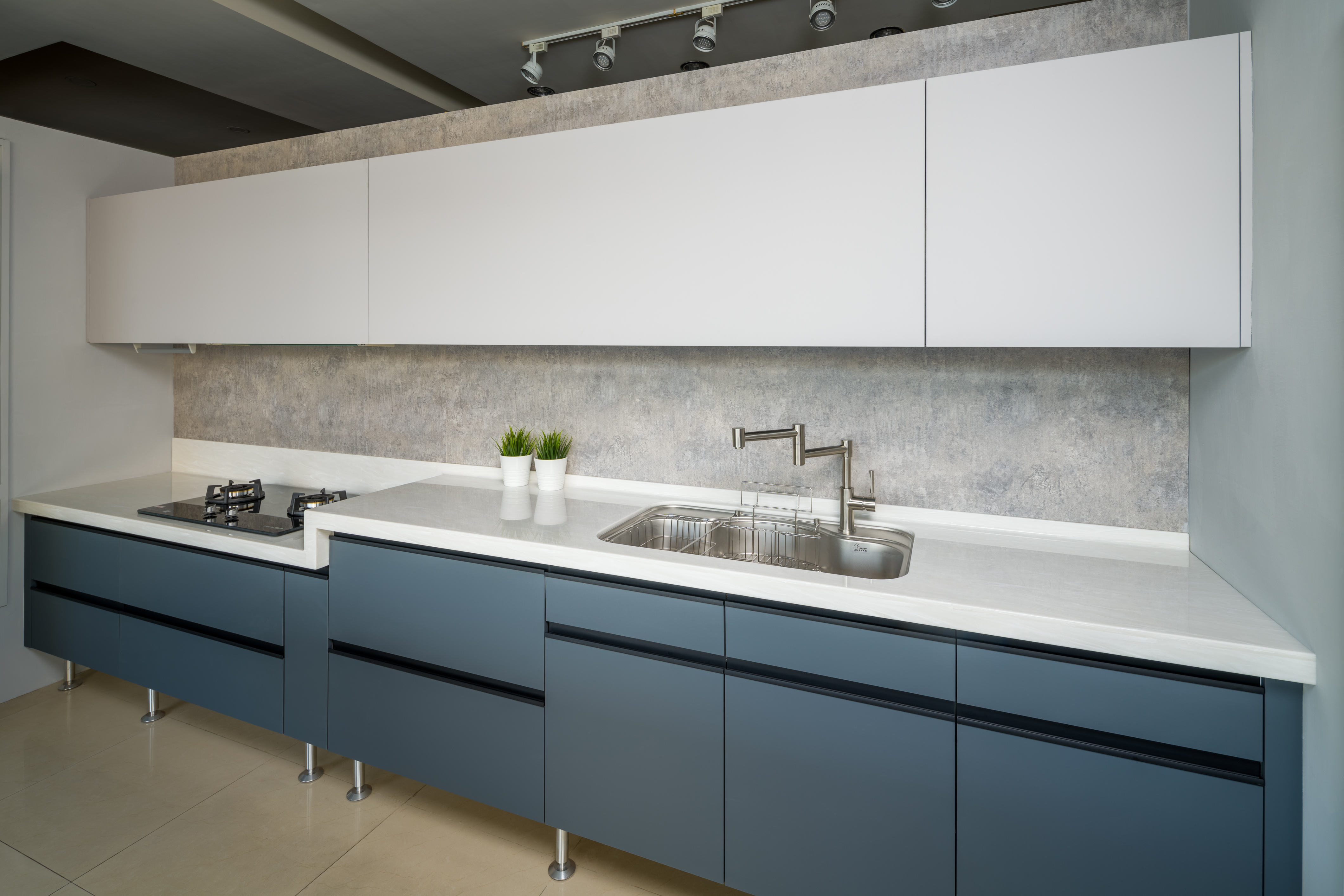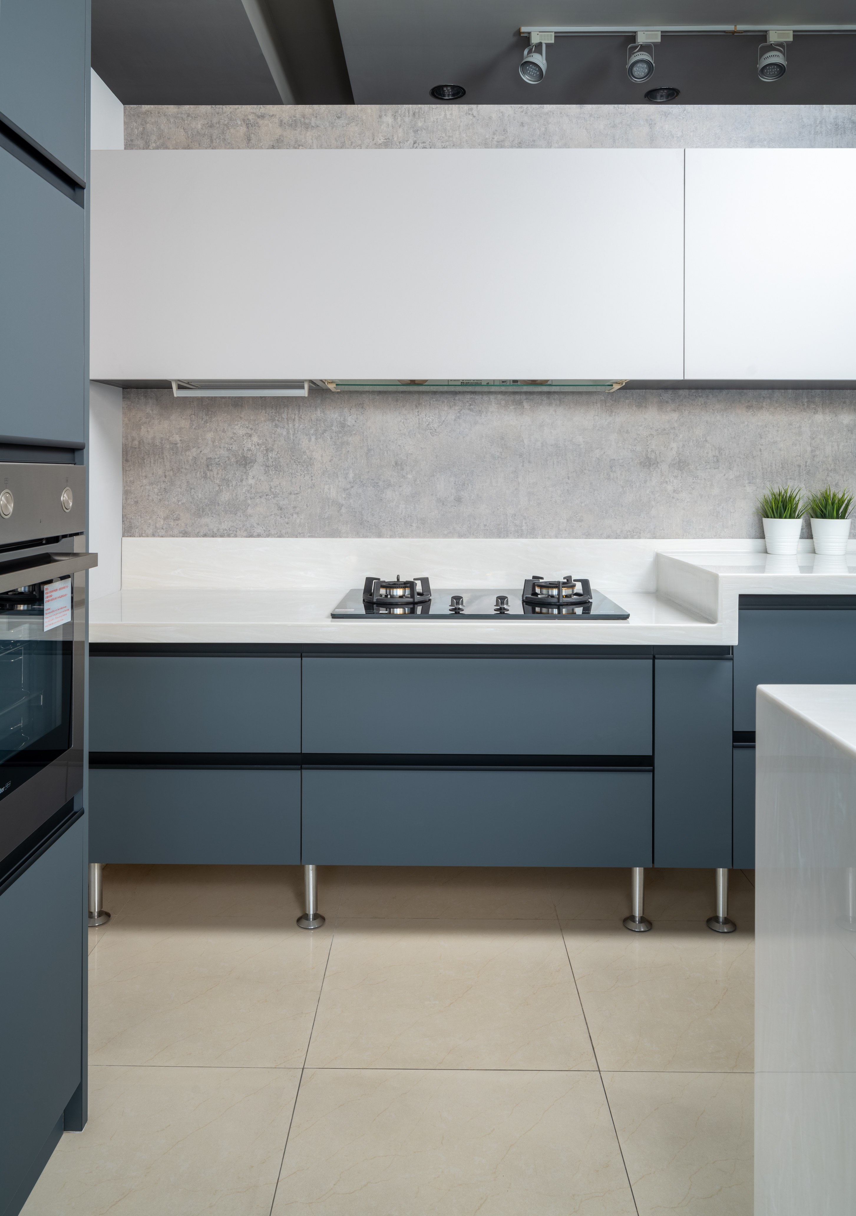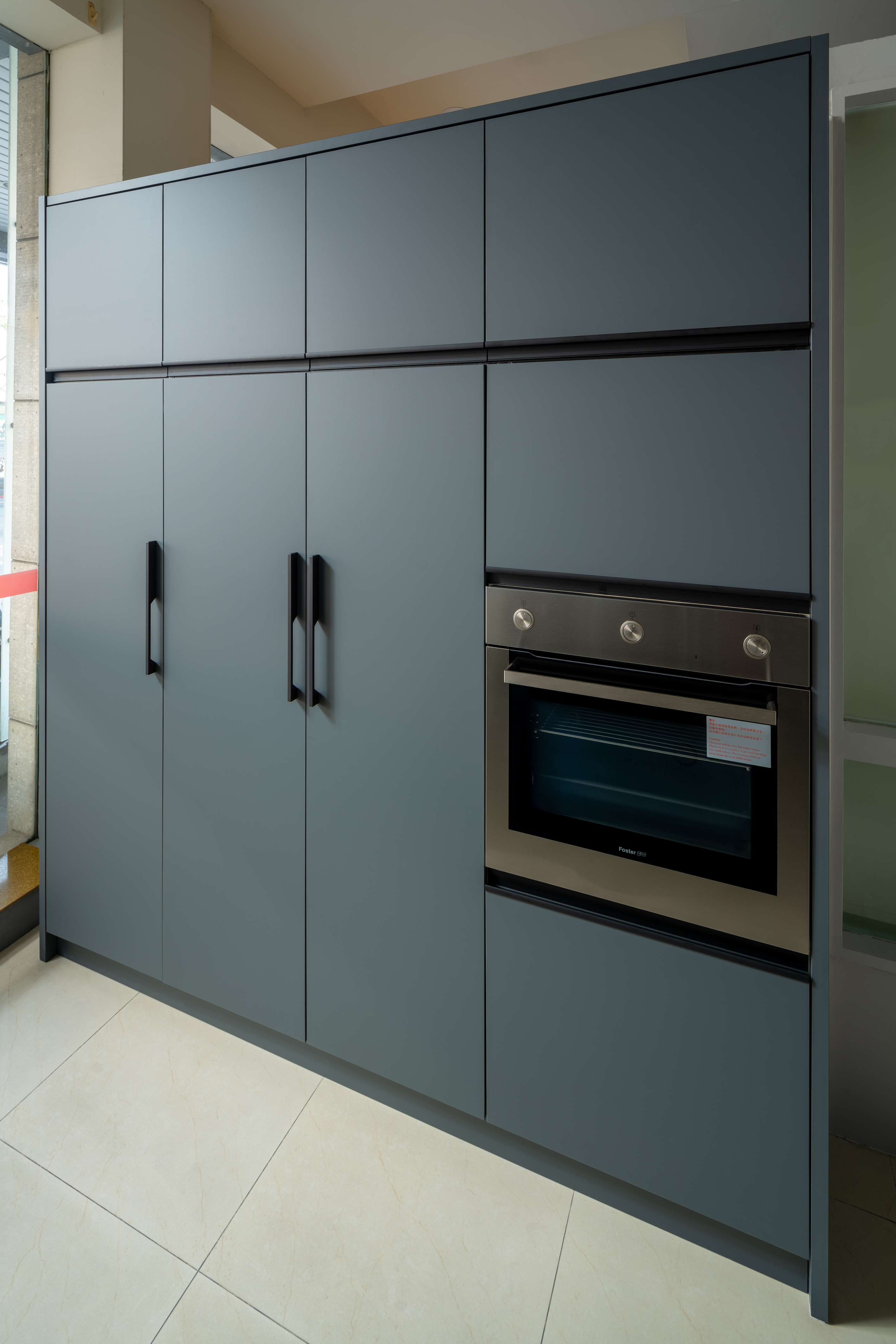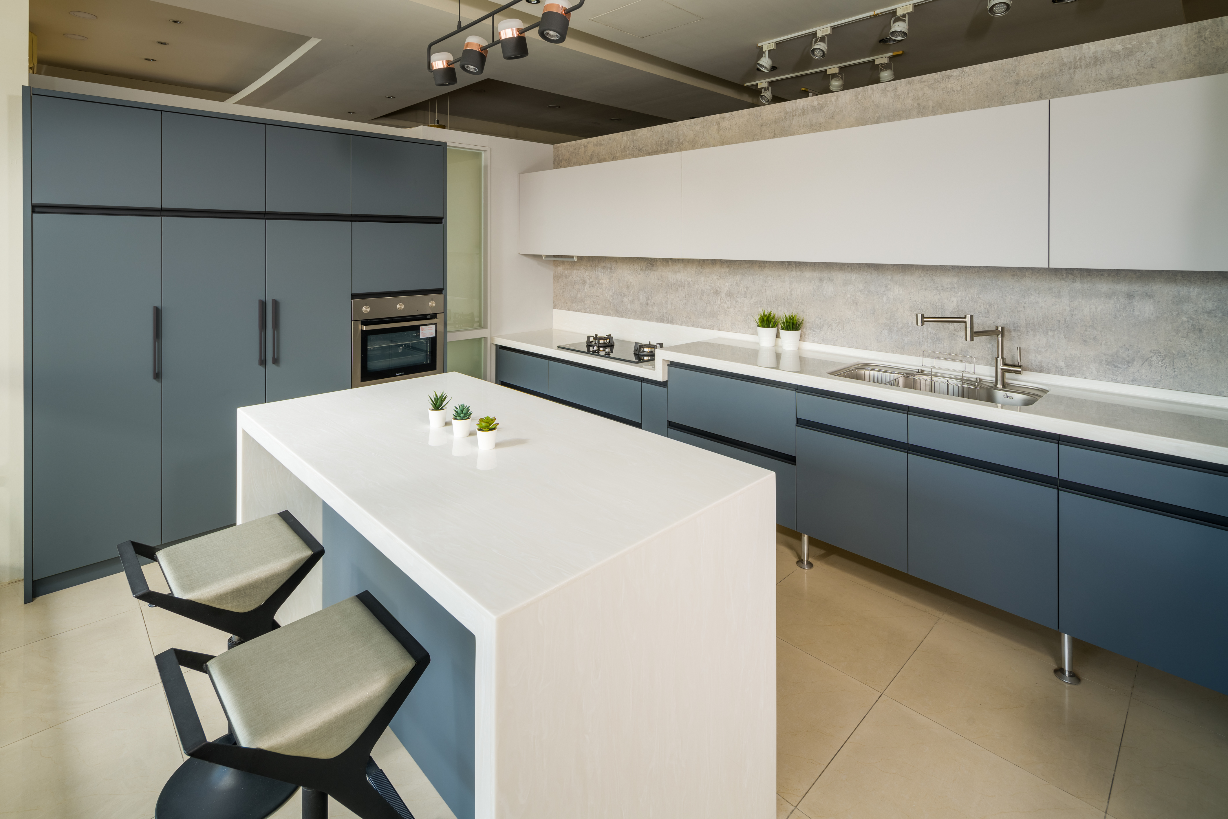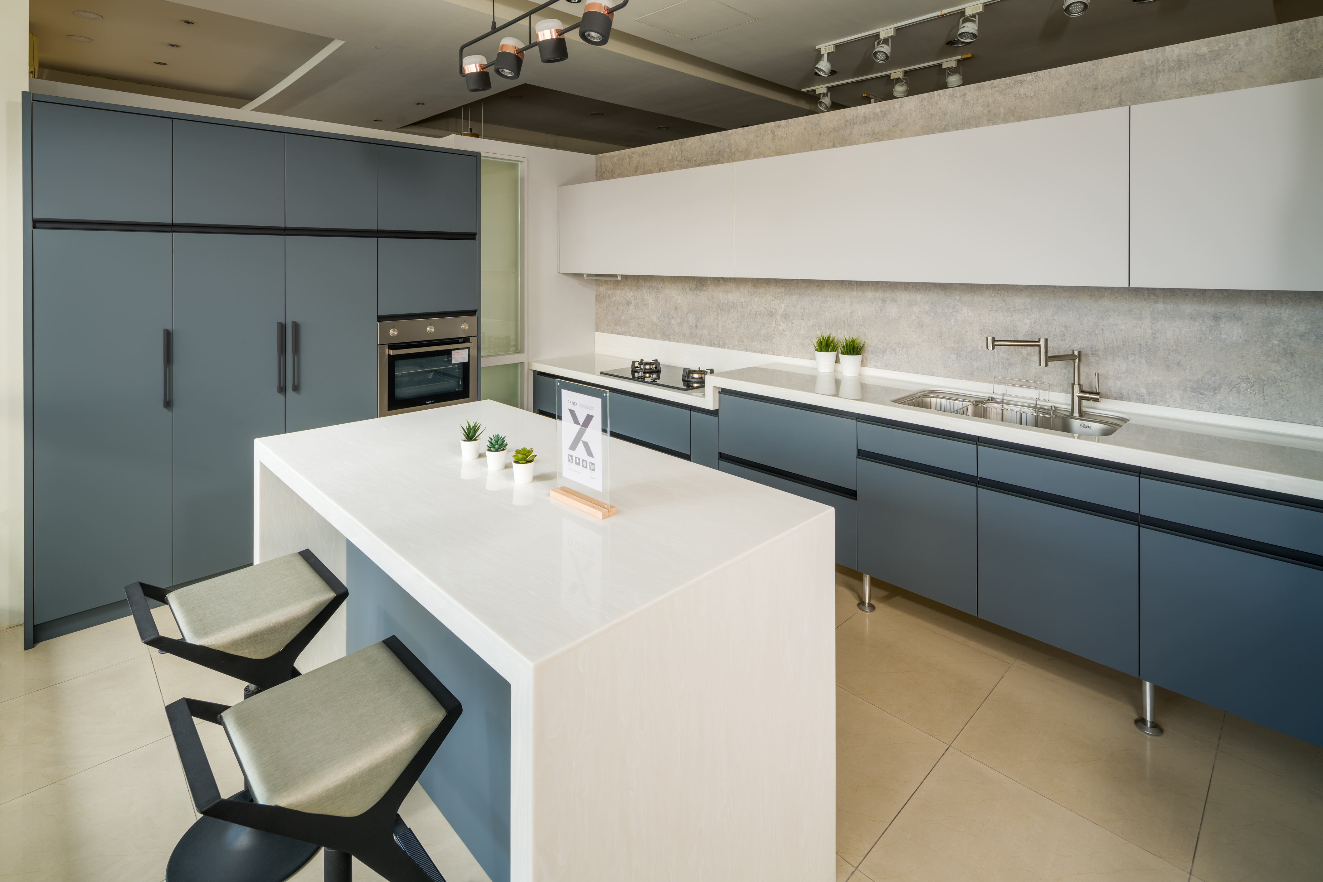 灰中帶藍,讓人想到無邊無際的大海,彷彿可以洗去忙碌日常所累積的疲憊,讓心緒徜徉在偌大的靜謐;廚房的一字型廚具搭配著FENIX® 櫃面,望向廚房,彷彿看見了那片寧靜汪洋,所有的煩擾都也無足輕重了。
