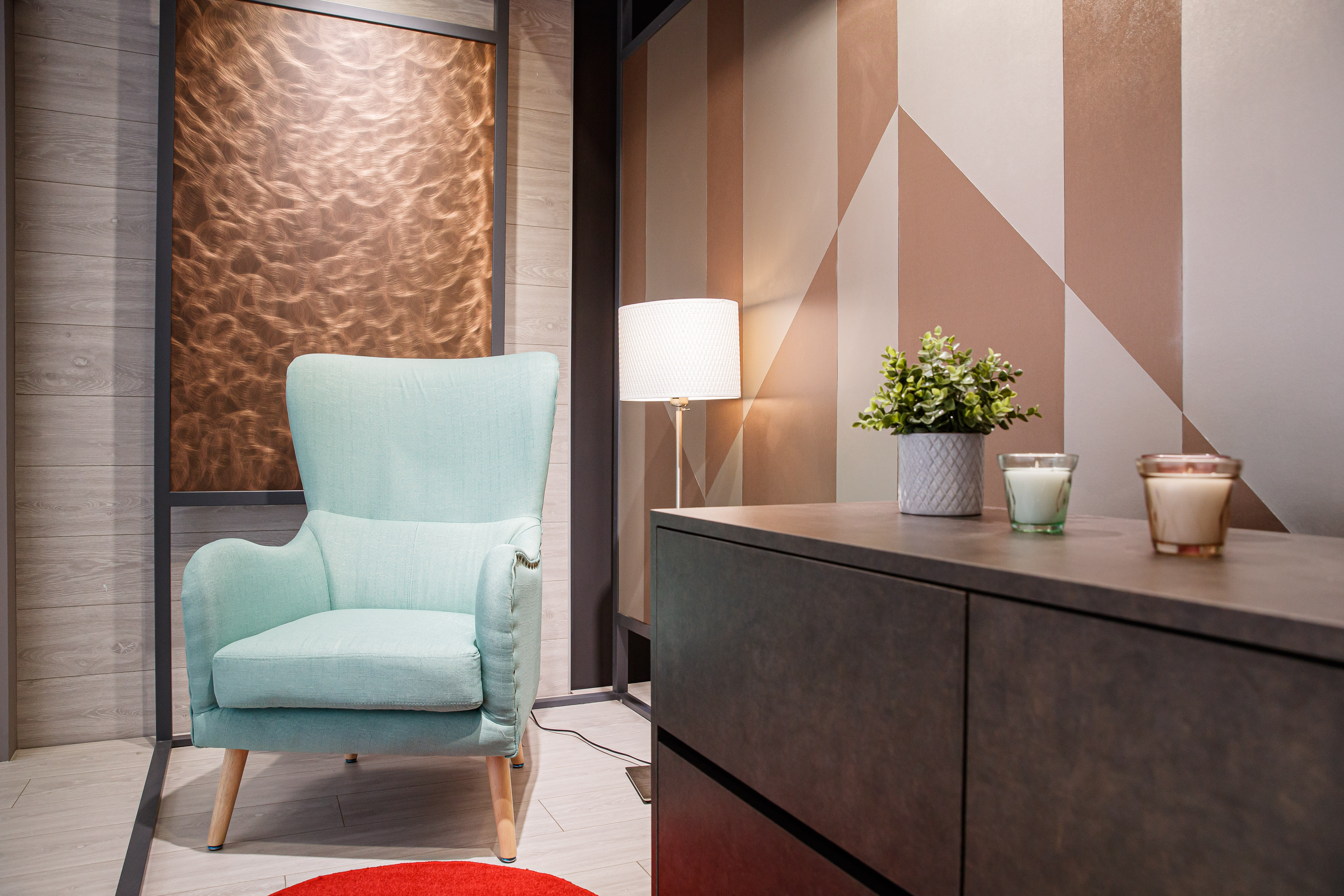 在走遍不同居家空間,體會每個轉角的溫度與質地後,便能來到展示牆面,近距離觀賞和觸摸富美家的全系列產品,包括明亮、鮮豔、內斂等各種顏色,以及石紋、木紋和金屬色澤等不同質地,都在此一覽無遺。最後,不妨到Lounge區的沙發上小憩一會兒,與專業人員聊聊,如何落實此刻浮現在你腦海中——「家」的理想模樣。