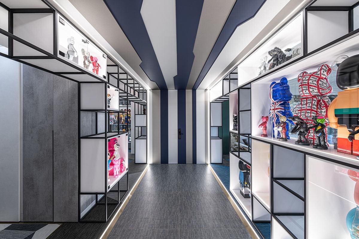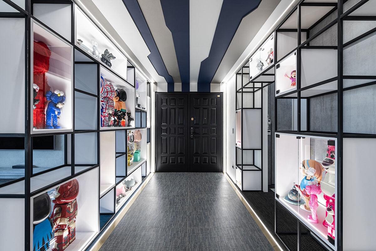 運用藍白灰色塊,巧妙延伸視覺,低調金屬質感襯托繽紛的玩具收藏;簍空幾何的展示設計,玩心自然流瀉,摩登中帶著奇幻童趣。打造一間專屬大人的玩具屋,找回如孩子般開心的玩味時光!